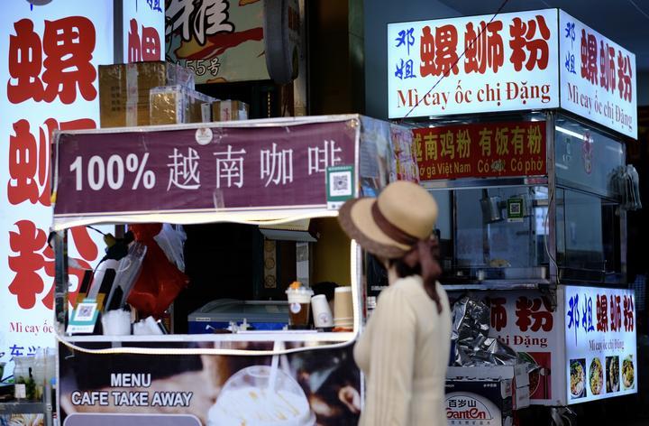 這是在中國東興口岸拍攝的街景。中越兩國遊客在這裏品嚐特色美食、咖啡。新華社記者鄭開君攝
