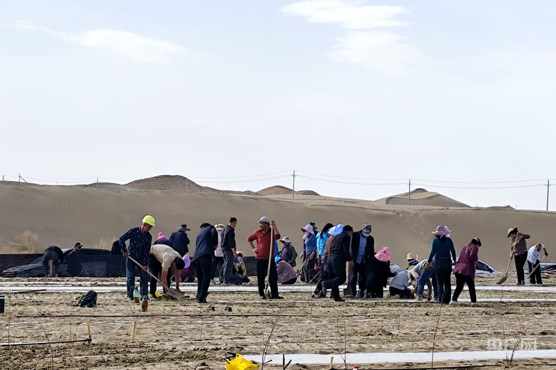 在民豐縣防沙治沙試驗站,林草技術中心的技術人員與護林員協作栽種耐旱中草藥苗 (央廣網發 馬曉杉 攝)