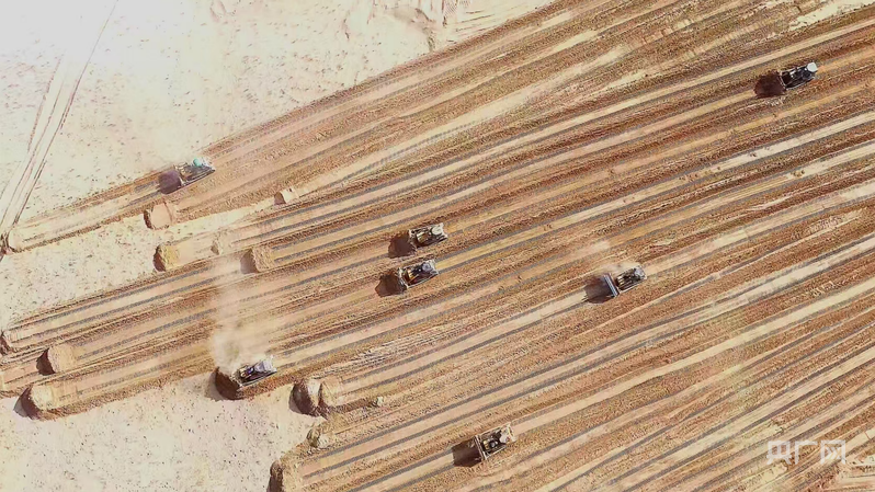 “民豐縣經過無數次試驗,選擇蘆葦鋪設草方格沙障,帶動了蘆葦收割產業,參與收割的農牧民人均增收7740元左右。”賈磊説。