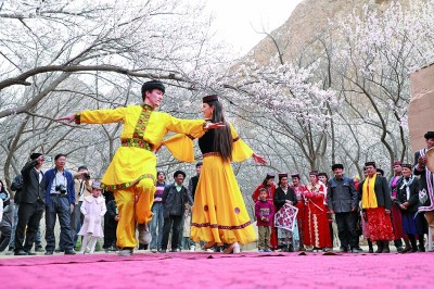 新疆阿克陶縣塔爾鄉民間藝人與遊客在杏花樹下共舞。毛吾拉江·艾山江攝
