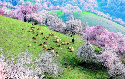 你且看伊犁河谷——蜿蜒的山坡披覆錦繡,層層疊疊的粉白自谷底漫卷山腰。風起時,花瓣簌簌飄落,遠處的牧人勒馬駐足。恍惚間,難辨是大地托起了雲霞,還是雲霞墜入了人間。