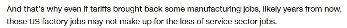 文章認為,即便特朗普的關税政策能夠實現一定的製造業迴流,其帶來製造業工作崗位也無法彌補美國可能因為服貿行業會遭受的反制打擊而流失的就業。