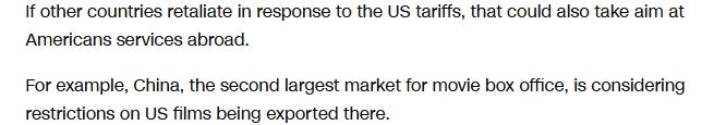 基於美國在服貿領域的巨大優勢,當中國的反制措施對準美國電影產業並引發多家美國電影股票大跌時,美媒的預警自然合乎情理。畢竟,在這一領域優勢有多大,遭到反制時,受到的打擊就有多劇烈。