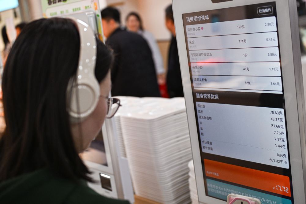 3月21日,在中國農業大學東校區,一名學生查看“智慧食堂”設備上的餐食營養數據信息。新華社記者 陳鍾昊 攝
