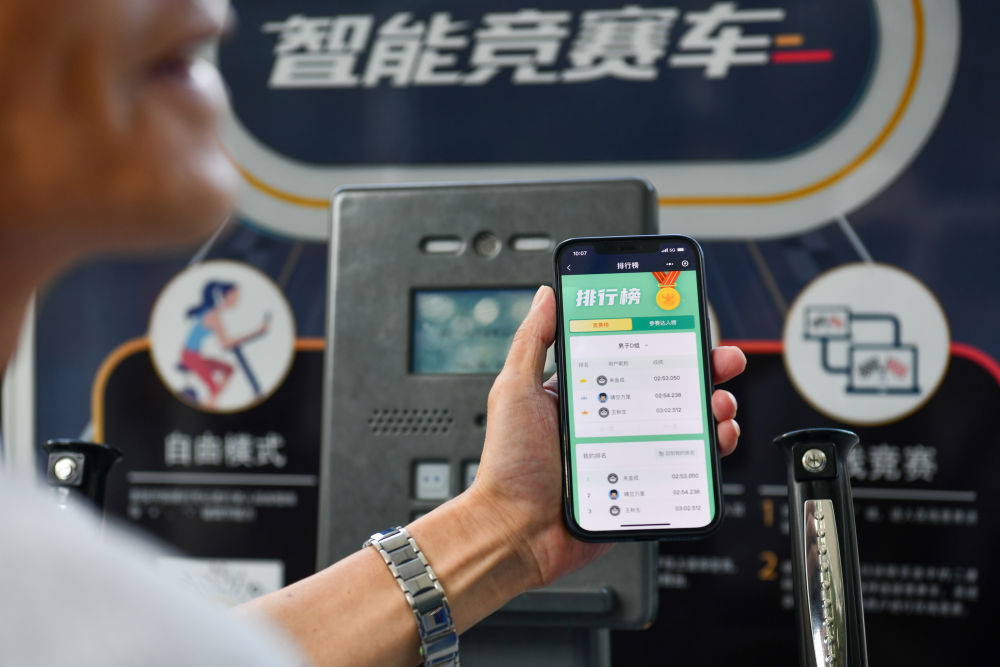 2024年1月20日,一位市民在騎行結束後展示個人成績。新華社記者 梁旭 攝