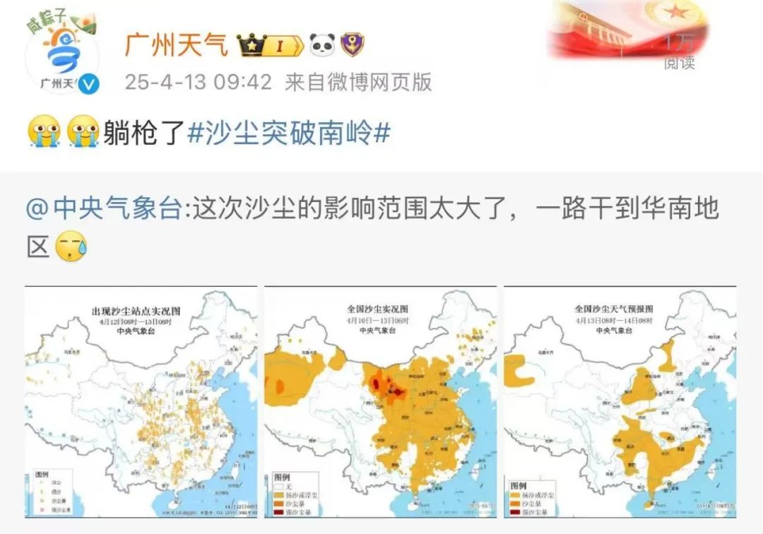 據@中央氣象台 消息:這次沙塵的影響範圍太大了,一路幹到了華南地區。