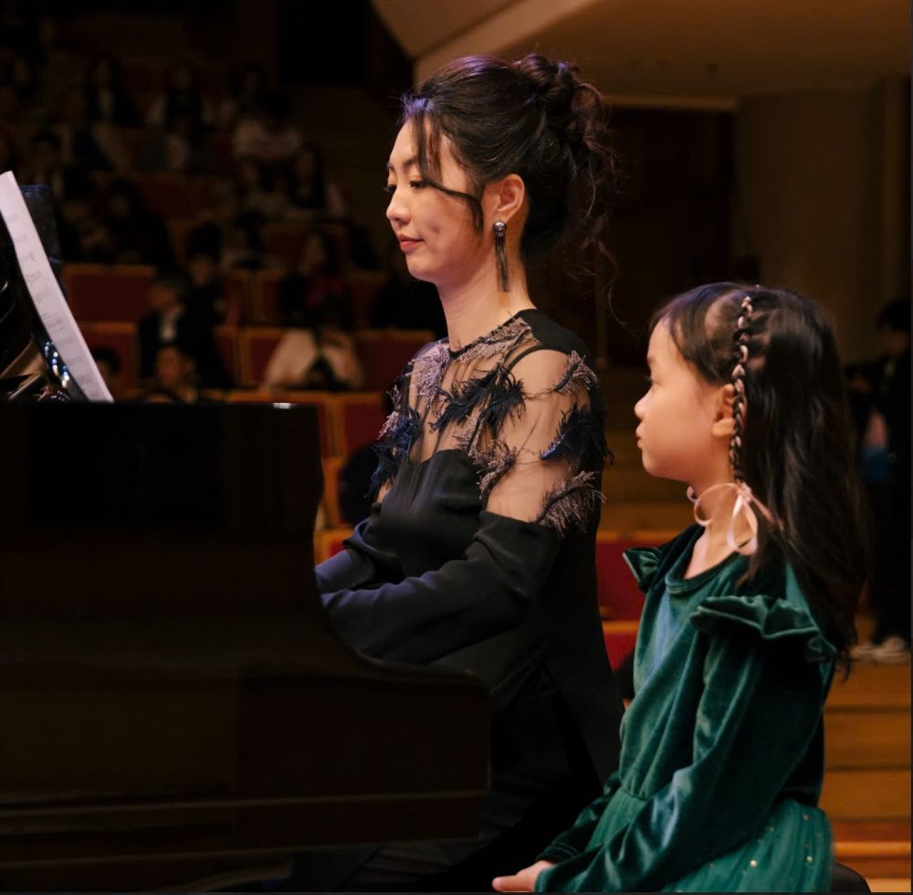 2024年12月8日,在位於越南首都河內的國家音樂學院,莫雙雙在一場音樂會中彈奏鋼琴,女兒童棉綿在旁翻譜。