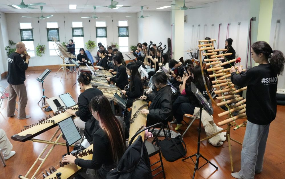 3月30日,在越南首都河內,童光榮(右上)指導“新活力”民族樂團排練。
