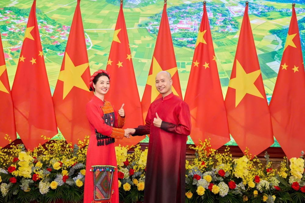 在河內的音樂廳裏,越南指揮家童光榮揮動指揮棒,中國作曲家莫雙雙靜靜伴奏。這對跨國伉儷用音樂搭起橋樑,將兩國觀眾的心緊緊相連。