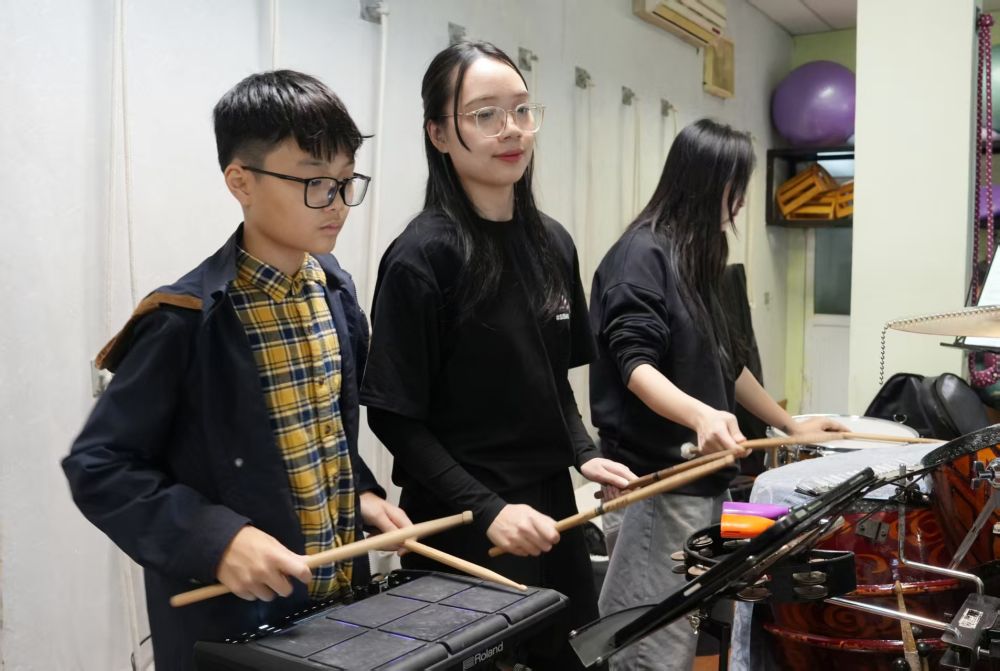 3月30日,在越南首都河內,兩人的兒子童俊希(左一)參加“新活力”民族樂團排練。
