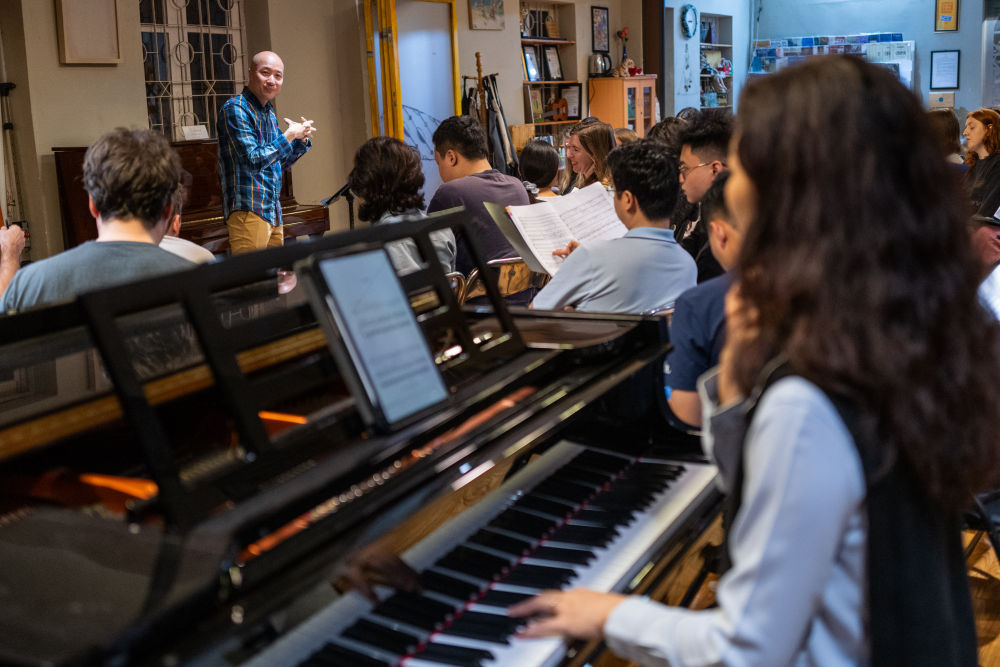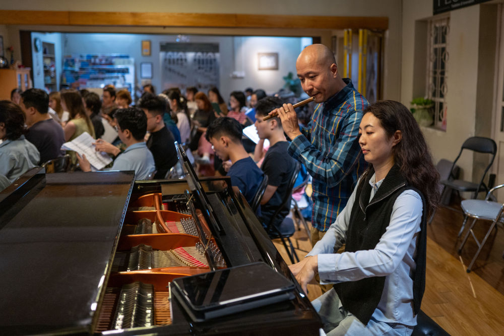 3月28日,童光榮與莫雙雙在位於越南首都河內的家中教授“新活力”民族樂團成員樂理知識。