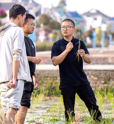 雲南勐海縣勐遮鎮曼恩村,雲南大學農學院青年教師黃光福(右)在稻田中給學生授課。