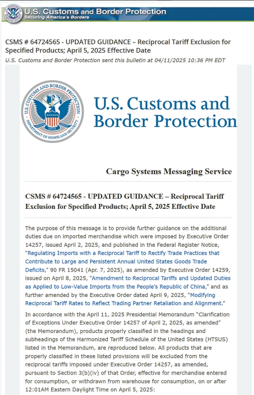 【環球時報駐德國特約記者 青木 環球時報特約記者 甄翔 於文】美國東部時間11日深夜,美國海關與邊境保護局在官網上發佈了一條通知:聯邦政府已同意對智能手機、電腦、芯片等電子產品免除“對等關税”;豁免的產品適用於4月5日以後進入美國的電子產品,已經支付的“對等關税”可以尋求退款。該通知沒有規定被豁免產品的原產地,因此被認為也包含中國,這被媒體稱為“美對華關税出現首個鬆動信號”。有統計顯示,被豁免的電子產品佔據中國對美出口總量的20%-25%,美國73%的智能手機、78%的筆記本電腦都在中國生產。對此,中國商務部發言人13日表示,中方正在對有關影響進行評估。應該説,這是美方修正單邊“對等關税”錯誤做法的一小步。我們敦促美方正視國際社會和國內各方理性聲音,在糾錯方面邁出一大步,徹底取消“對等關税”的錯誤做法,回到相互尊重、通過平等對話解決分歧的正確道路上來。