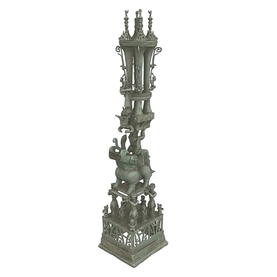 銅獸馱跪坐人頂尊銅像由出自三星堆不同考古區域的文物,通過人工智能技術“跨坑拼接”而成,其組件分別來自2021年3號坑出土的銅頂尊跪坐人像、1986年2號坑出土的銅尊口沿以及2022年8號坑出土的銅神獸。