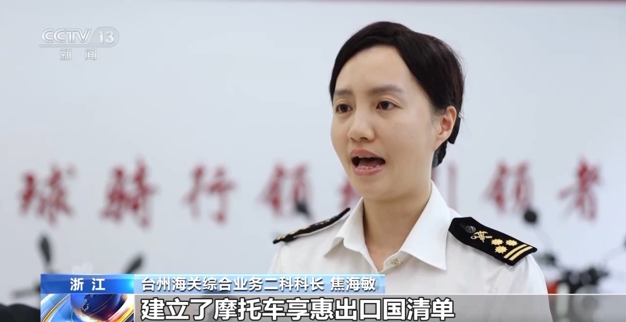 *台州海關綜合業務二科科長 焦海敏:*建立了摩托車享惠出口國清單,從關税減讓、原產地規則等方面為企業提供精準指導,幫助企業用好用足政策,加快拓展周邊市場。