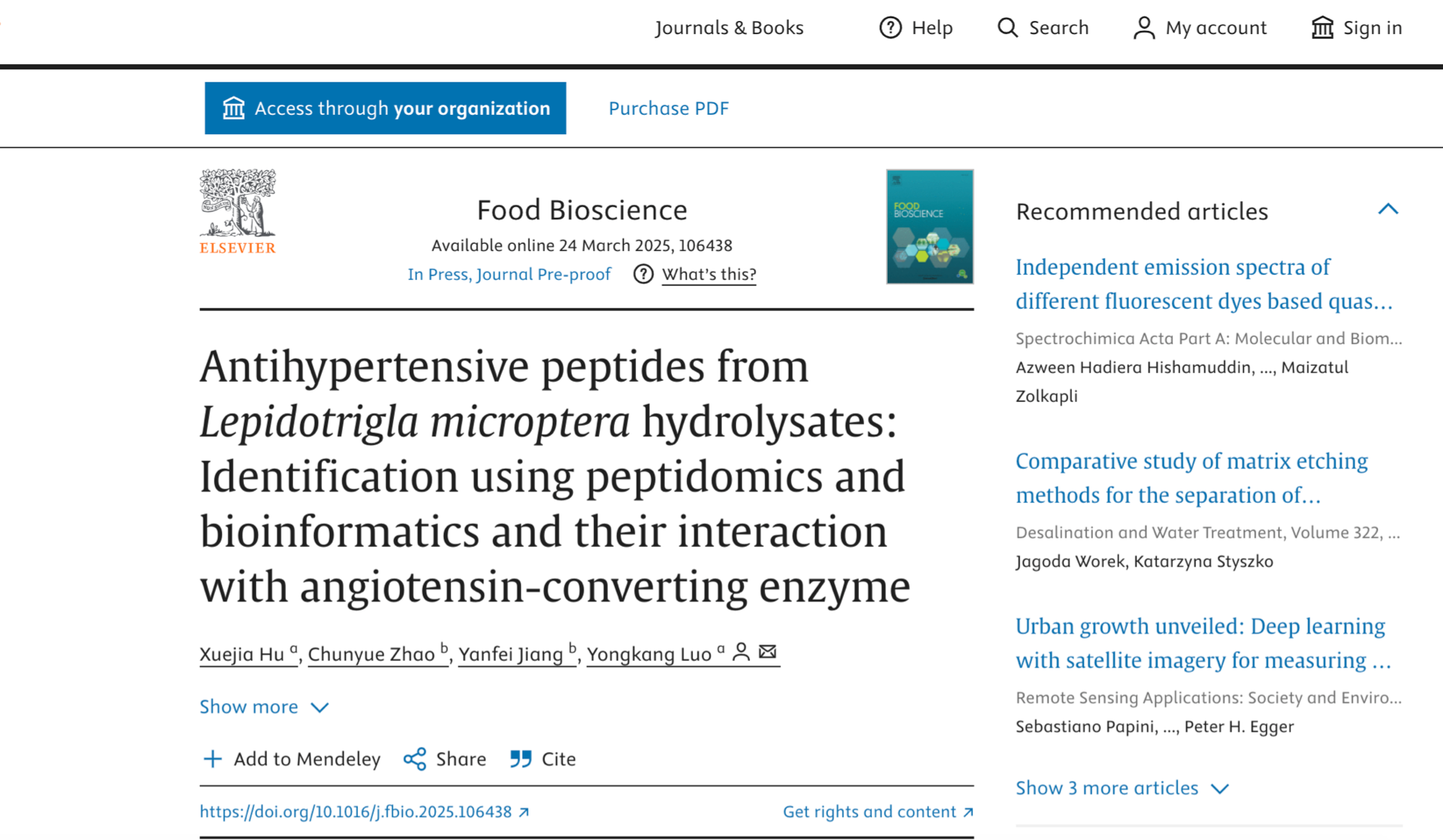 高血壓是全球範圍內普遍存在的慢性疾病。傳統合成藥物雖有效但存在副作用,因此,從天然食物中提取安全高效的抗高血壓肽(AHPs)引起廣泛關注。五個女博士研究員以低值海洋魚類——紅娘魚為原料,對魚肉中提取的降血壓肽(AHPs)進行篩選、鑑定以及生物信息學分析,結果發現,DLTAGLLE是新型血管緊張素轉換酶(ACE)抑制肽,通過非競爭性抑制機制結合ACE非活性位點,形成穩定複合物。該研究不僅對深入理解多肽物質的結構與功能以及開發新型藥物、保健品具有重要意義,還為海洋生物的高價值利用提供了新的途徑,目前論文已被收錄在《Food Bioscience》(《食品生物科學》)期刊中。