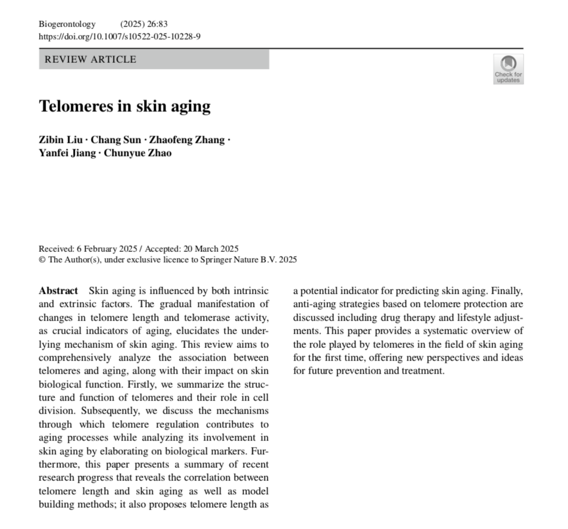 首先,研究員們通過總結大量研究方法和實驗技術,分析端粒——一種特殊的DNA-蛋白質複合物——可作為皮膚衰老過程的重要預測指標。還總結了從端粒側治療皮膚衰老的策略,包括端粒酶激活劑,抗氧化劑和營養補充劑的應用,以及生活方式(如飲食、運動和睡眠等)調整等對端粒長度的影響。該研究成果被收錄在《Biogerontology》(生物老年學)期刊中,為未來預防和治療皮膚衰老提供了新的思路和方法。