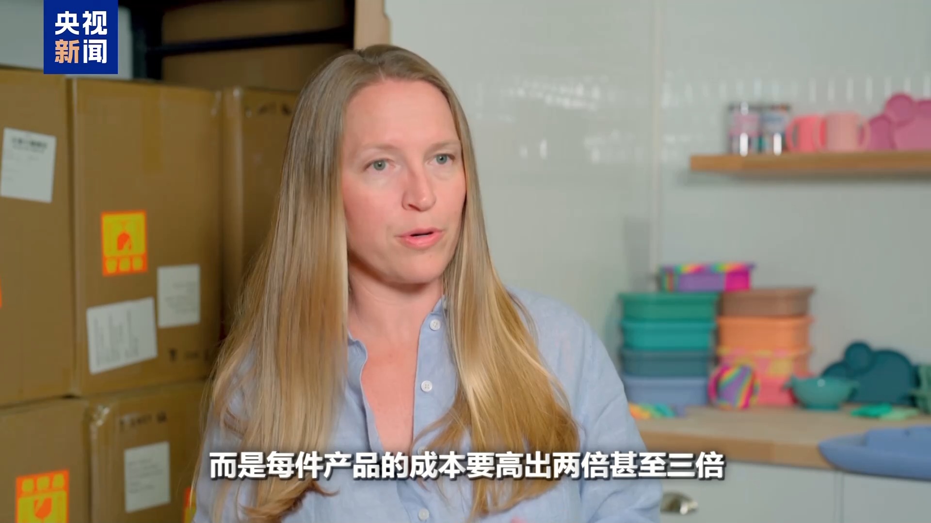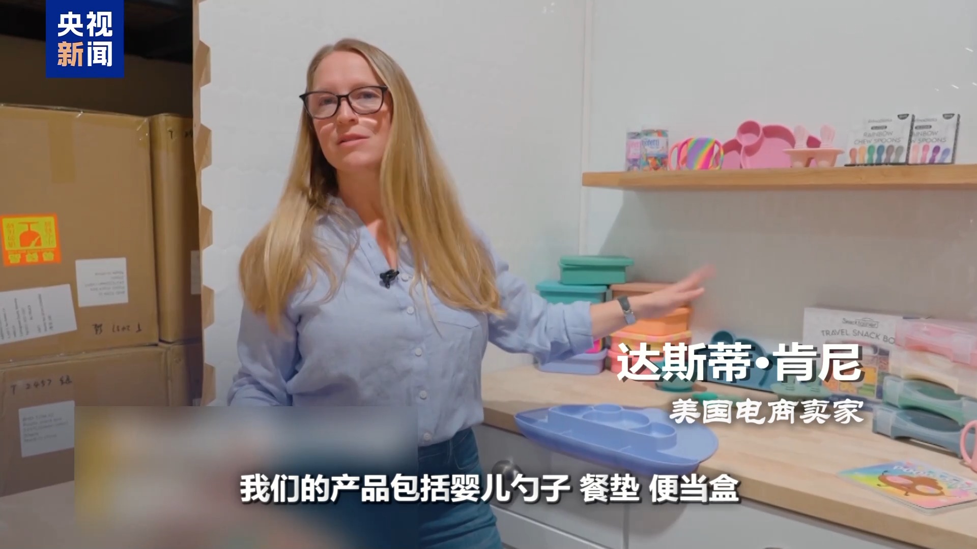 *美國電商賣家 達斯蒂·肯尼:*我們的產品包括嬰兒勺子、餐墊、便當盒、碗、盤子還有杯子。這些產品都是在中國生產的,它們被裝在這些箱子裏,通過海運運到這裏。