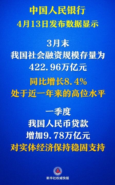 4月13日中國人民銀行發佈了主要金融數據,首季社會融資規模增量超15萬億元、新增貸款9.78萬億元、3月末廣義貨幣M2餘額同比增長7%……一個個數據展現着金融對實體經濟保持穩固支持,也折射出實體經濟需求持續回暖。