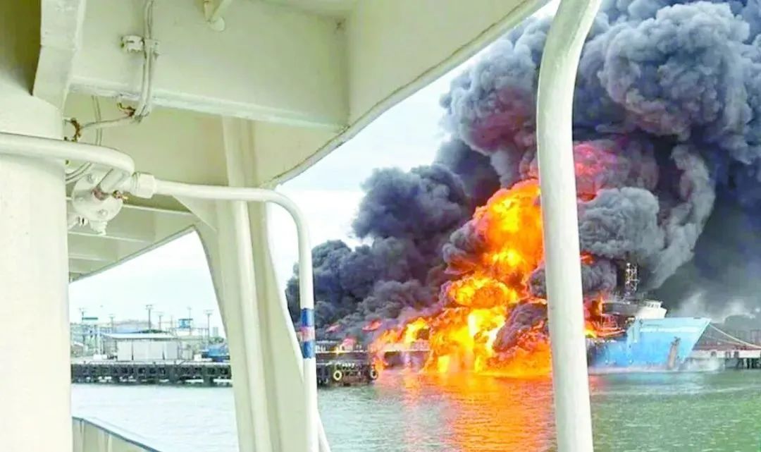 資料圖:被烏軍導彈命中後起火爆炸的俄羅斯渡輪