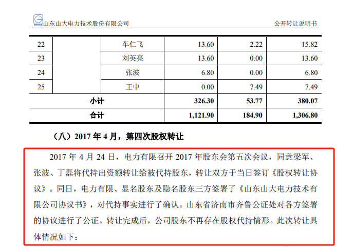山大電力此前在新三板掛牌,然而其當時披露的信息如今卻疑點重重。公司2018年披露的《公開轉讓説明書》顯示,2017年4月公司進行了股權轉讓,宣稱轉讓完成後股東不再存在股權代持情形,山東省濟南市齊魯公證處對相關協議進行了公證。彼時,山大電力股東還出具《承諾函》,確認直接或間接持有公司的股權不涉及任何爭議、仲裁或訴訟,不存在通過協議、信託或任何其他方式為他人代為持有申請人股權的情形。通力律師事務所據此也出具了法律意見書,認為公司股權代持已真實解除,符合掛牌條件。