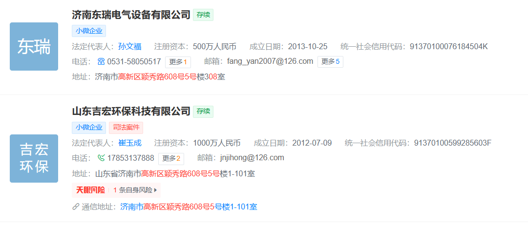 另外,招股説明書顯示,山大電力經營地為濟南市高新區穎秀路608號5號樓,而這一註冊地址與濟南東瑞電氣設備有限公司、山東吉宏環保科技有限公司相同。