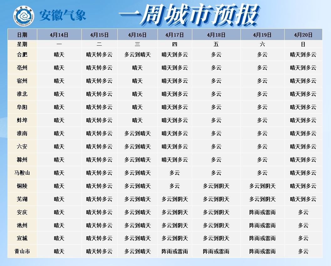 安徽省氣象台預計,17日至19日安徽南部多陣雨或雷雨天氣,21日全省有一次雷陣雨天氣過程,其中大別山區和沿江江南部分地區中到大雨,其餘時段全省以晴到多雲天氣為主。