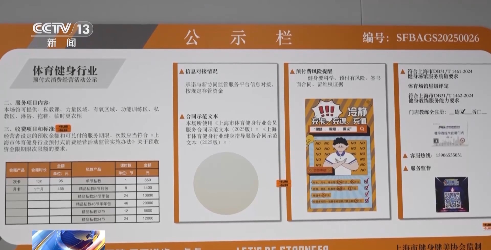 *《實施辦法》要求經營者通過經營公示和書面告知,向消費者提示預付款風險。*目前,據此設計製作的統一模板已向企業推廣發放,不少健身門店和體育場館已在顯著位置公示服務項目、收費標準、經營場所租賃期限等經營信息,並承諾使用最新版上海市體育健身行業合同示範文本。