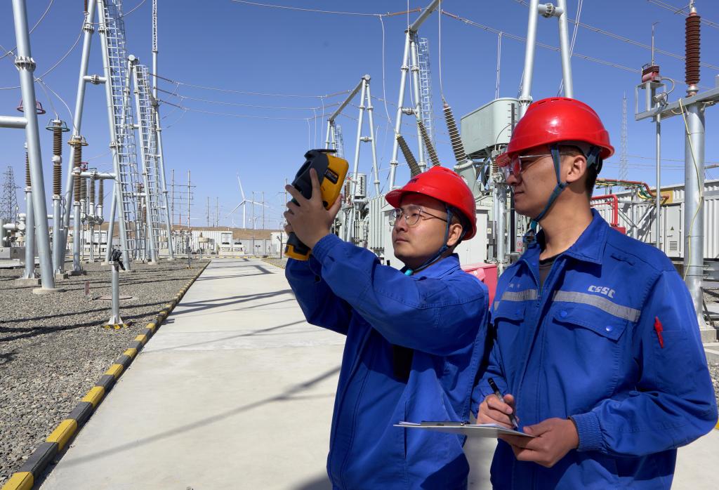 在中船集團十三間房百萬千瓦風電場,工作人員正在測量設備運行温度。新華社記者張嘯誠 攝
