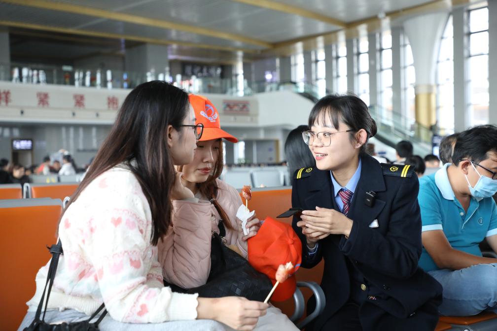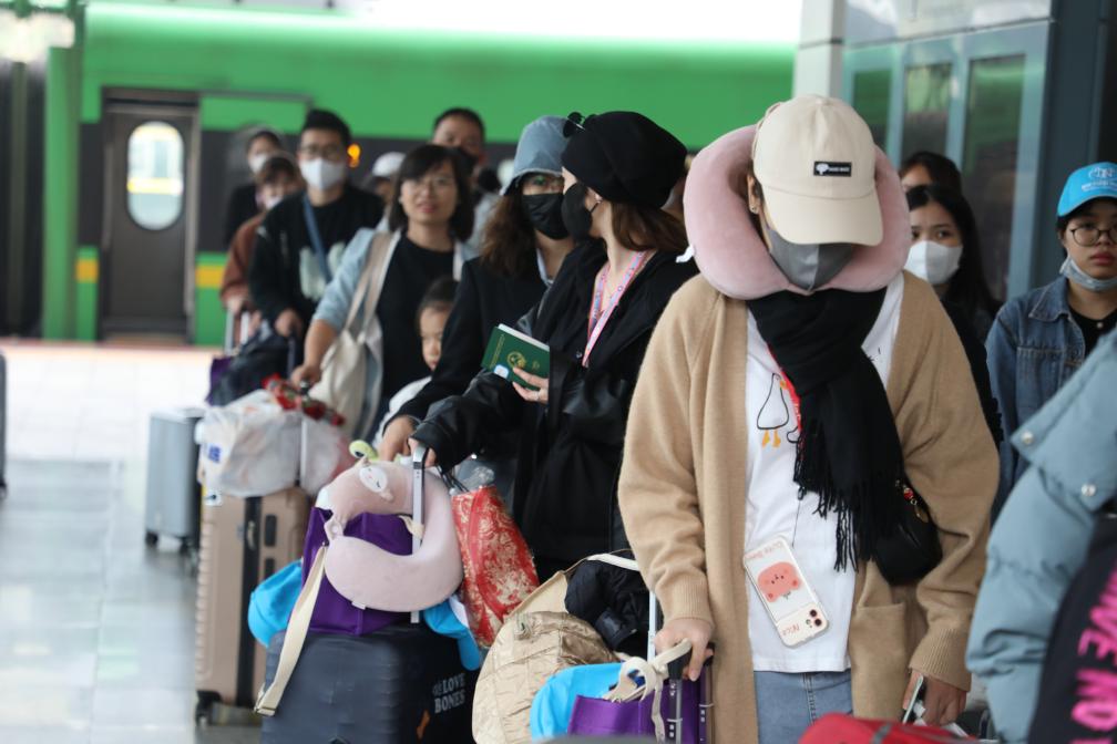 越南導遊黃文進正帶着一支由11名越南遊客組成的旅行團在此候車,他對身旁的遊客們説:“動車非常準時,乘車手續便捷,提前40分鐘到車站就可以了。”