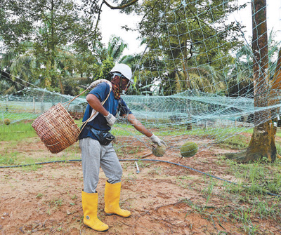 馬來西亞頂好水果有限公司的工人在採收榴蓮。