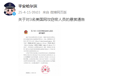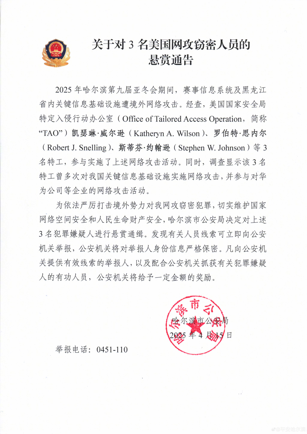 【環球時報-環球網報道 特約記者袁宏】15日上午,哈爾濱市公安局發佈“關於對3名美國網攻竊密人員的懸賞通告”稱,2025年哈爾濱第九屆亞冬會期間,賽事信息系統及黑龍江省內關鍵信息基礎設施遭境外網絡攻擊。經查,美國國家安全局特定入侵行動辦公室3名特工參與實施了上述網絡攻擊活動。