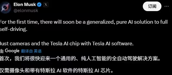 馬斯克:特斯拉將推通用型純AI全自動駕駛解決方案