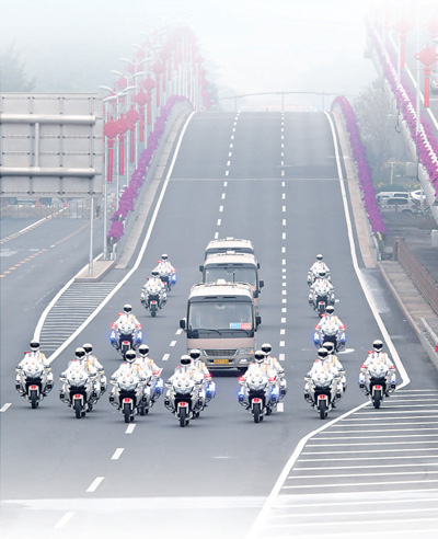 北京釣魚台國賓館,國賓護衞隊以V字形向前行駛。頭車駕駛員、中隊長邵明路帶領編隊成員在5秒鐘內完成加速,摩托車在疾馳中迅速變換隊形,車與車銜接流暢、渾然一體,各車左右偏差不超過5釐米。指揮員豎起大拇指:“咱們的隊員好樣的!”