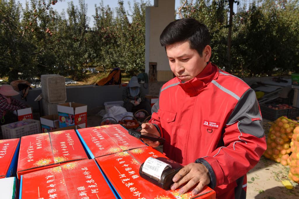 2024年10月,在新疆阿克蘇地區,快遞員在打印蘋果線上銷售的訂單。新華社記者高晗 攝