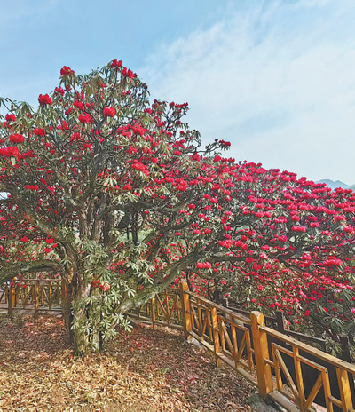 山頂處,一棵被木柵欄圍起來的杜鵑樹格外顯眼:樹幹直徑約80釐米,樹高數米,花朵密密匝匝掛滿樹冠……這棵樹的樹齡超過1200年,粗糙皸裂的樹幹寫滿歲月滄桑。