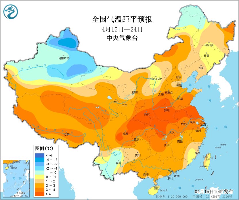 未來10天,除新疆中北部平均氣温較常年同期偏低2~3℃外,全國其他大部地區氣温偏高1~3℃,其中華北南部、黃淮、江漢、江淮、四川盆地等地部分地區偏高4~6℃。