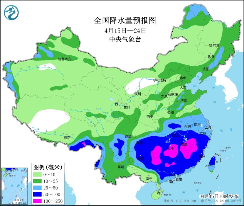未來10天(4月15-24日),江漢東部和南部、江淮、江南、華南北部和東部及四川南部、貴州、西藏東南部等地累計降水量有40~80毫米,其中江南、華南北部、貴州東部、西藏東南部等地的部分地區有100~130毫米,局地超過150毫米;新疆北部和西部、華北、黃淮、東北地區東部、內蒙古東北部等地累計降水量有10~20毫米,局地超過30毫米;上述大部地區累計降水量較常年同期偏多3~7成,局地偏多1倍以上。