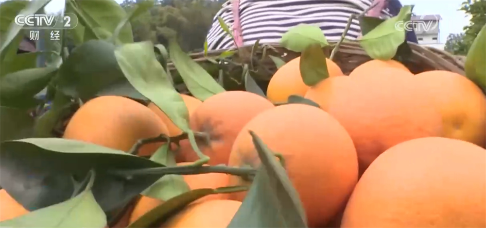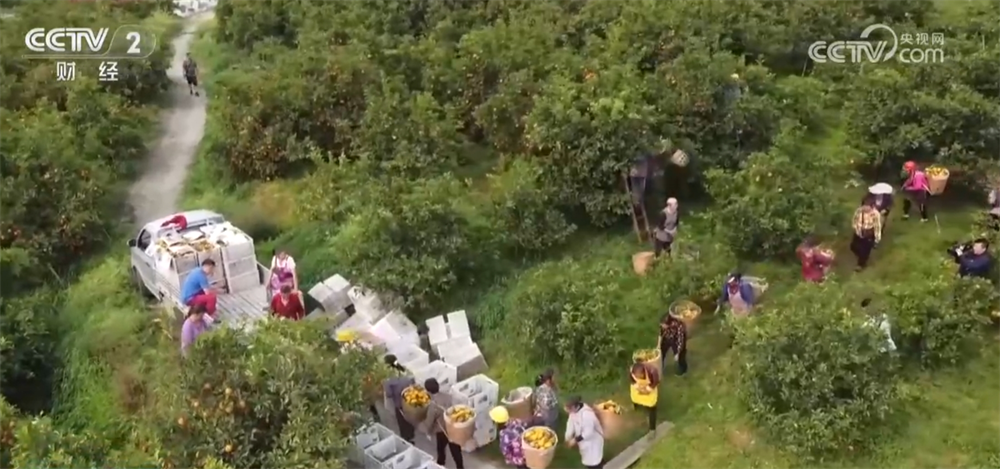 在血橙種植基地裏,漫山遍野的晚熟血橙碩果累累。果農們忙着採摘、分揀、裝箱,一箱箱打包好的晚熟血橙被快速裝車發往各地。