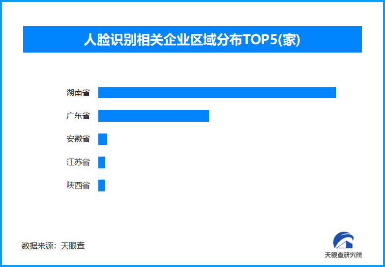 從區域分佈來看,湖南省、廣東省人臉識別相關企業數量位居前列,分別為超過2700餘家和1200餘家。