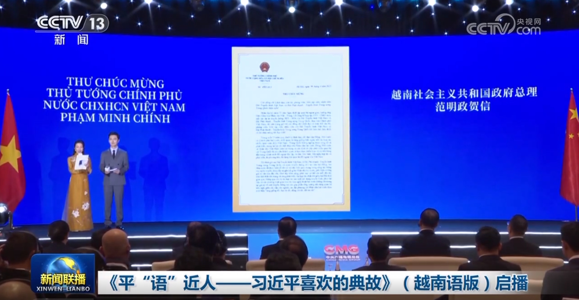 央視網消息(新聞聯播):在中共中央總書記、國家主席習近平對越南進行國事訪問之際,4月14日,由中國中央廣播電視總枱製作的《平“語”近人——習近平喜歡的典故》(越南語版)在越南啓播。慶祝中越建交75週年人文交流活動同日在河內舉行。越南總理範明政致賀信,對節目播出和活動成功舉辦表示祝賀。