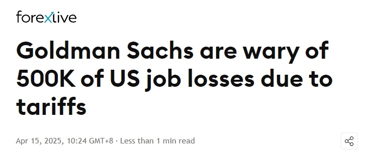 △財經網站forexlive報道:高盛擔憂關税將導致美國流失50萬個工作崗位
