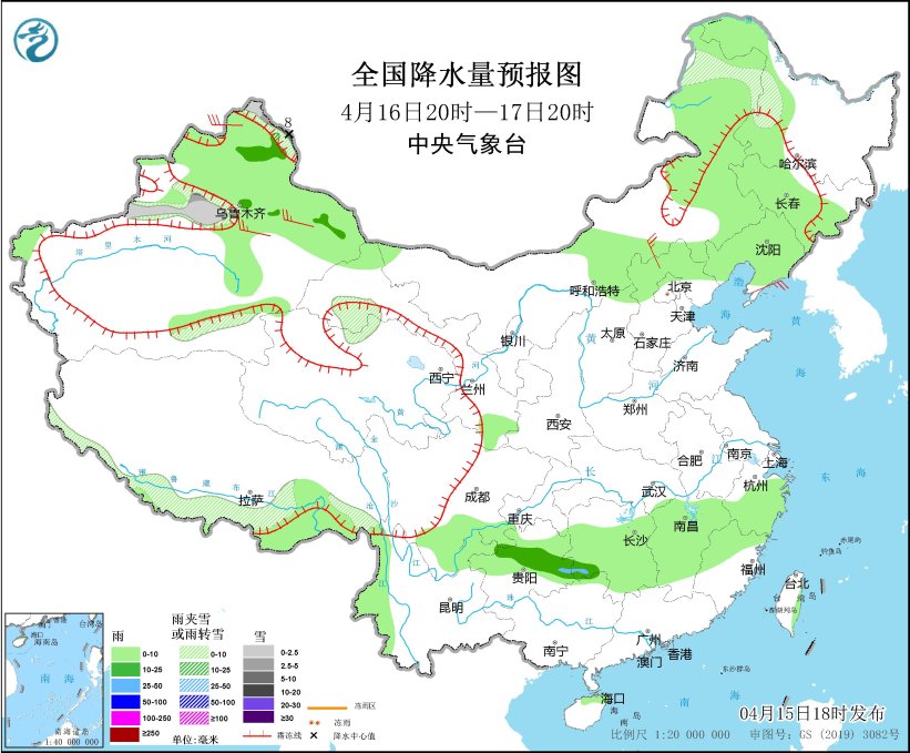 *4月16日20時至17日20時,*新疆沿天山地區和阿勒泰地區、甘肅西北部、內蒙東北部、西藏南部等地部分地區有小到中雪或雨夾雪,其中,新疆沿天山和阿勒泰部分地區有大雪(5~8毫米)。新疆北部、甘肅南部、西藏東南部、四川盆地東南部、雲南西部、貴州、江南南部等地部分地區有小雨,其中,北疆東部、貴州中部、湖南南部等地部分地區有中雨,局地大雨。新疆大部、青海、內蒙古大部、河北北部等地部分地區有4~6級風(見圖4)。