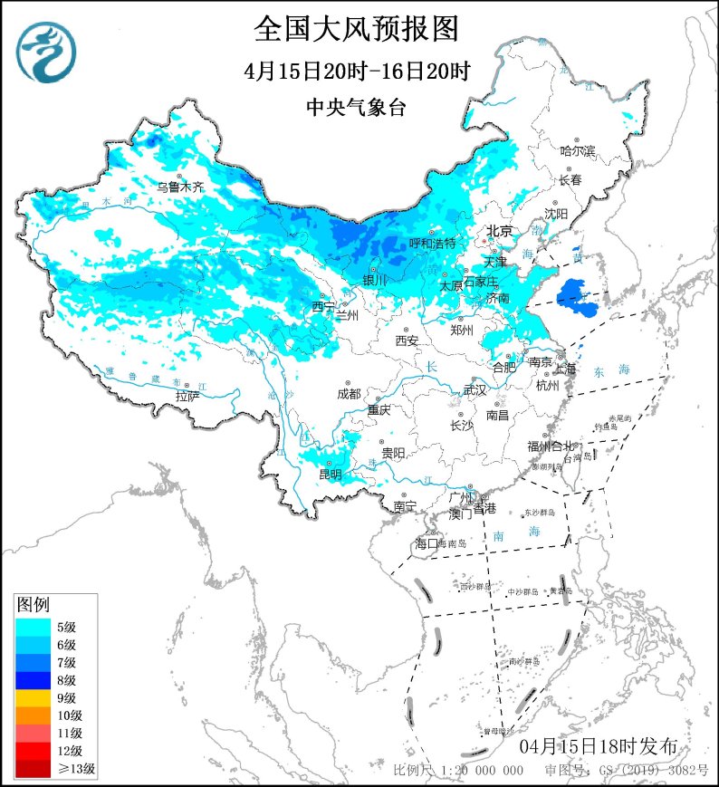 未來一週,北方地區多大風,西北部分地區有沙塵天氣。*中央氣象台4月15日18時發佈大風藍色預警:*15日20時至16日20時,新疆北部、青海、甘肅河西、寧夏北部、陝西北部、內蒙古中西部、山西、河北南部、天津大部、河南東部、山東大部、蘇皖北部以及雲南東部等地有5~6級、陣風7~8級的大風,其中,新疆東北部、內蒙古西部等地平均風力可達7級,陣風9~10級;黃海中南部部分海域有7級、陣風8級的西南風(見圖1)。