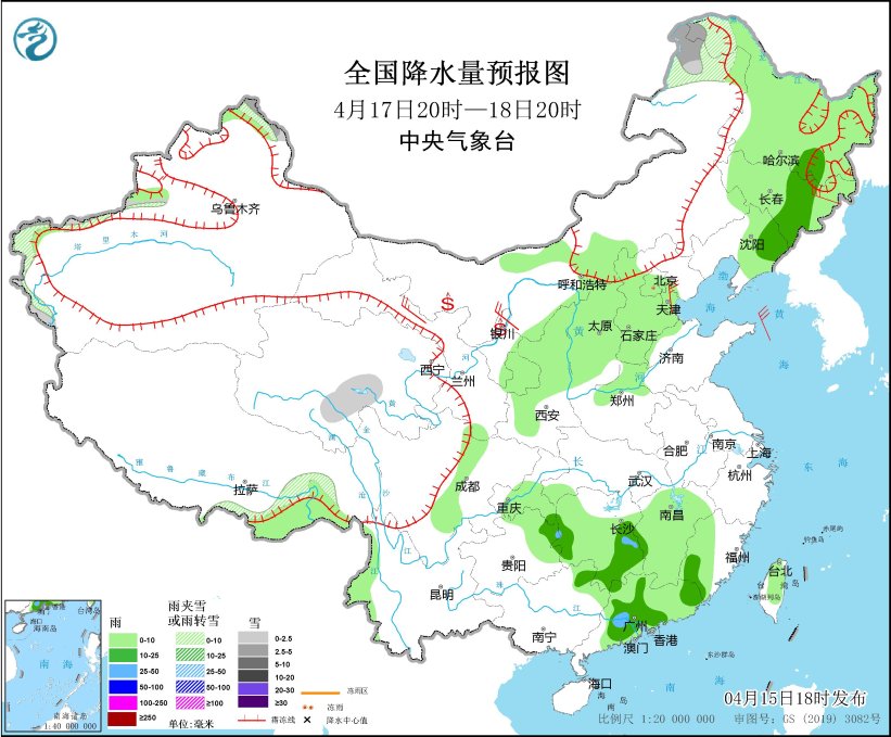 *4月17日20時至18日20時,*新疆沿天山地區和阿勒泰地區、青海東南部、內蒙東北部等地部分地區有小到中雪或雨夾雪。西北地區東部、華北、東北、西藏東南部、四川盆地、江南西南部、華南東部等地部分地區有小到中雨,其中,貴州東北部、湖南東部、廣東南部等地部分地區有大雨。甘肅河西、西北地區東部、華北北部等地部分地區有4~6級風。甘肅河西等地部分地區有揚沙或浮塵(見圖5)。