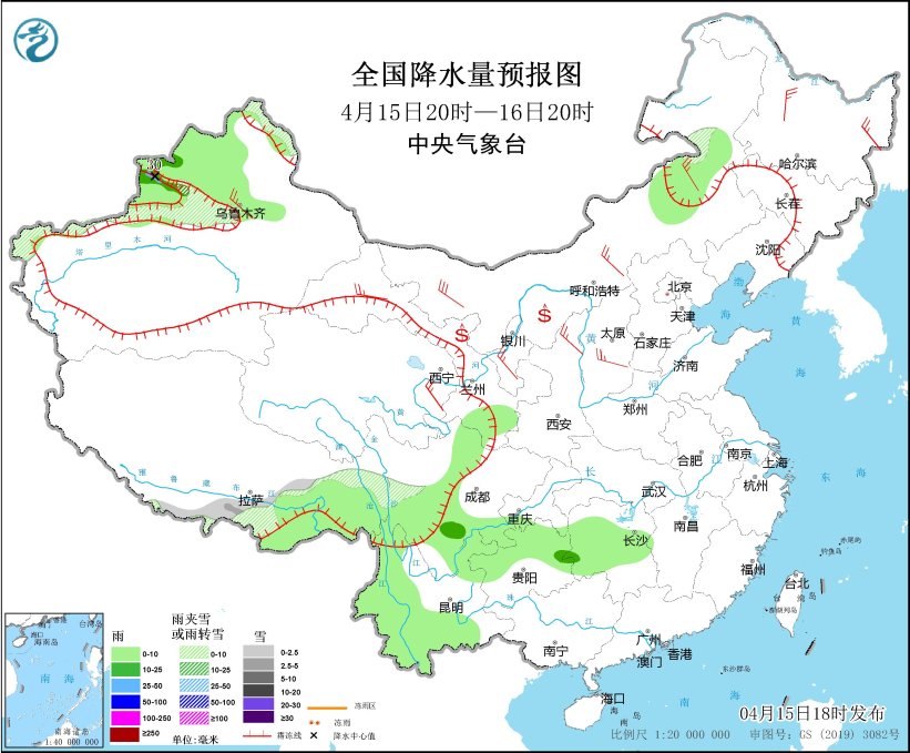 *4月15日20時至16日20時,*新疆沿天山地區和南疆西部山區、西藏東北部和南部、川西高原中部等地部分地區有小雪或雨夾雪,局地有中雪。新疆北部、甘肅南部、內蒙古東部、湖南中部、四川南部、貴州北部、雲南大部等地部分地區有小到中雨,其中,新疆伊犁河谷等地部分地區有大雨(25~30毫米)。新疆北部、西北地區中東部、內蒙古大部、黑龍江北部、山西等地部分地區有4~6級風。甘肅河西、內蒙古中部等地部分地區有揚沙或浮塵(見圖3)。