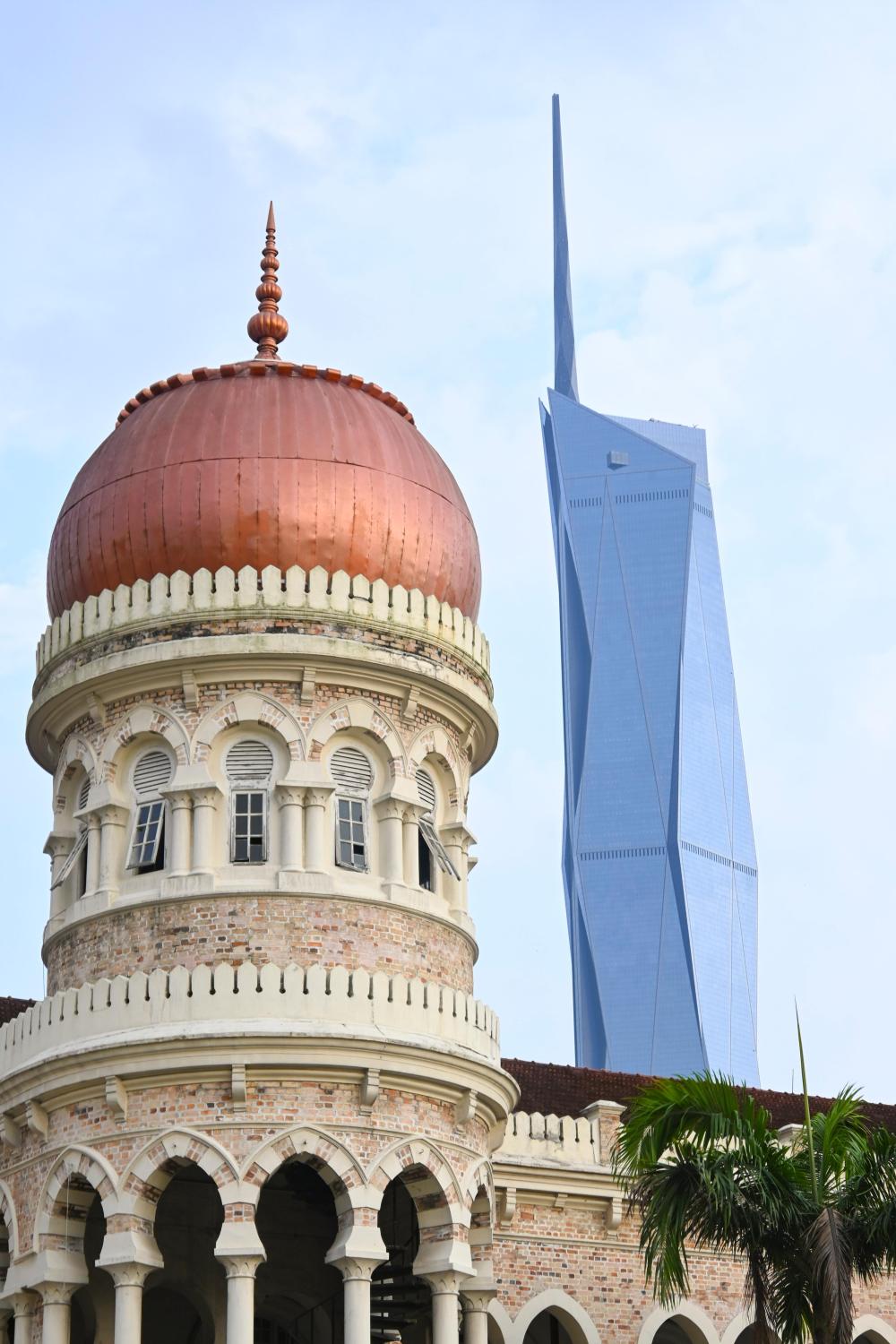 ↑這是2025年3月31日在馬來西亞吉隆坡拍攝的蘇丹阿都沙末大廈(前)和默迪卡118大樓。新華社記者 程一恆 攝