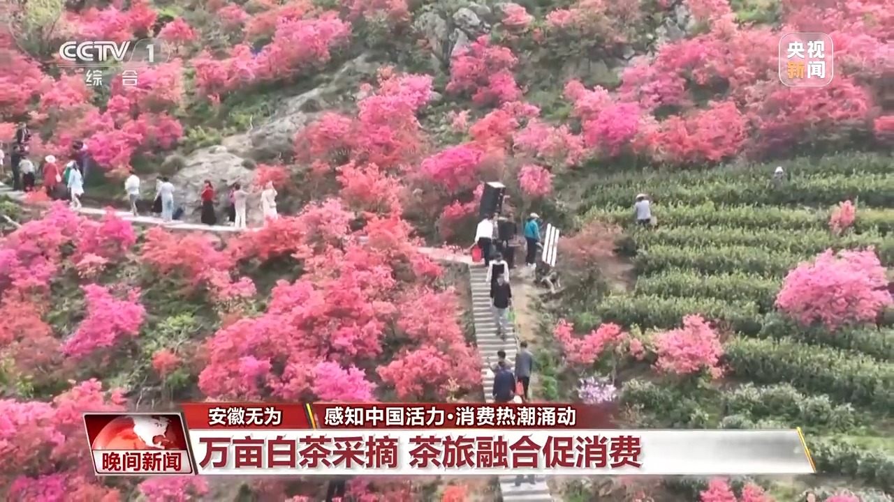 “茶葉搭台,經濟唱戲”。眼下,安徽無為一萬五千多畝白茶進入採摘期,當地依託獨特地理優勢,把茶區變成景區,推動茶旅融合,吸引眾多遊客前來體驗賞花品茶的樂趣。其中,崑山鎮的三公山白茶園通過實景沉浸式表演秀和體驗採茶,讓遊客身臨其境,擁抱春色,賞茶山花海之美。