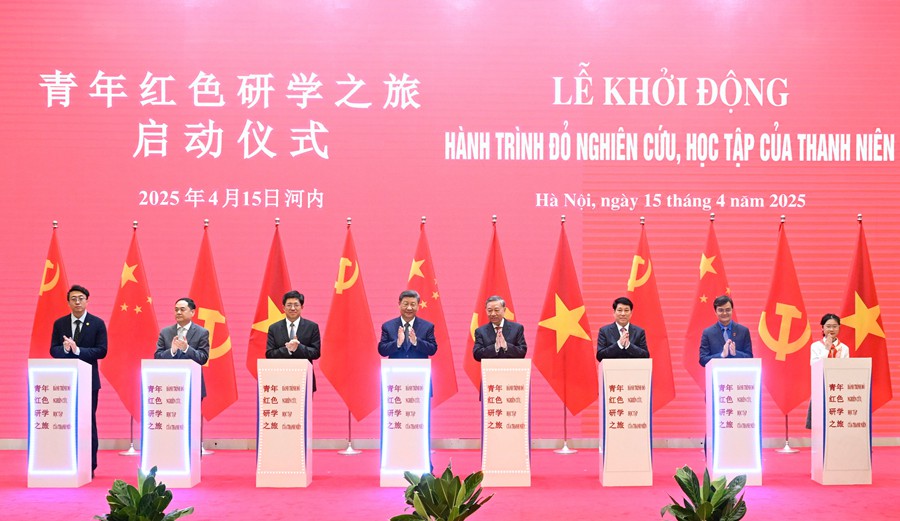 4月15日上午,中共中央總書記、國家主席習近平在河內國際會議中心同越共中央總書記蘇林、越南國家主席梁強共同會見中越人民大聯歡活動代表。這是活動後,習近平和蘇林、梁強共同啓動“紅色研學之旅”項目。