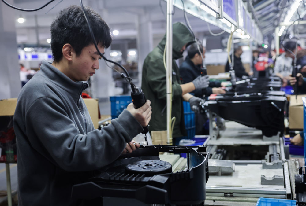3月11日,在位於慈谿市橫河鎮的寧波好使特電器有限公司的車間內,工人在流水線上組裝一批出口的園林工具。新華社記者 徐昱 攝